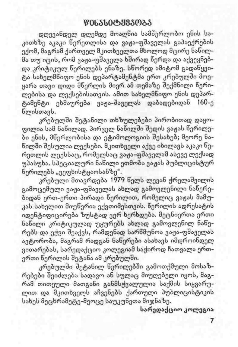სახელმწიფო ენის დეპარტამენტმა თბილისის მერიის კულტურის, განათლების, სპორტისა და ახალგაზრდულ საქმეთა სამსახურთან ერთად გამოსცა ვაჟა-ფშაველას 160 წლისთავისადმი მიძღვნილი საიუბილეო კრებული, რომელშიც შესულია ვაჟა-ფშაველას წერილები და ლექსები ენის შესახებ. ენის დეპარტამენტი მადლობას უხდის კორნელი კეკელიძის სახელობის საქართველოს ხელნაწერთა ეროვნულ ცენტრს, საქართველოს პარლამენტის ეროვნულ ბიბლიოთეკასა და ივანე ჯავახიშვილის სახელობის თბილისის სახელმწიფო უნივერსიტეტის ვაჟა-ფშაველას მე-მორიალურ მუზეუმს საარქივო და ნაბეჭდი მასალების ფოტოების მოწოდებისათვის.